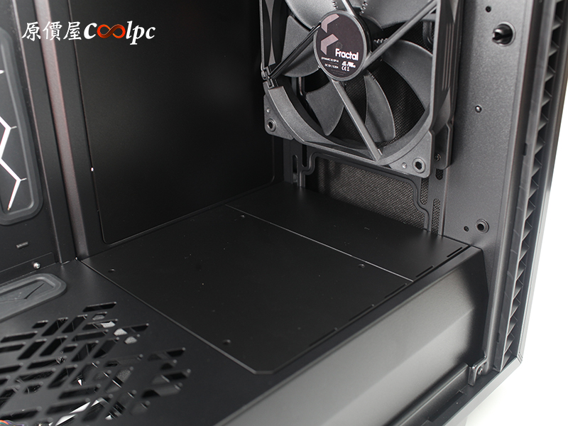 內部空間相當寬裕,可支援E-ATX(max 285 mm)/ATX/M-ATX/Mini-ITX主板尺寸,電源遮罩上方有Fractal Design新LOGO字樣,除此之外也設置顯卡直立架鎖孔(直立套件另購),以及2.5寸支架孔位!在主板托盤和電源遮罩上的背線孔均有黑化防割軟墊,安全又美觀!前後共附3顆自家Dynamic X2 GP-14風扇,而全機空間共可安裝9顆120/140mm風扇,水冷排前端最大支援360/280mm、底部最大支援240/280mm、頂端最大支援360/420mm,散熱裝置擴充性相當寬裕!