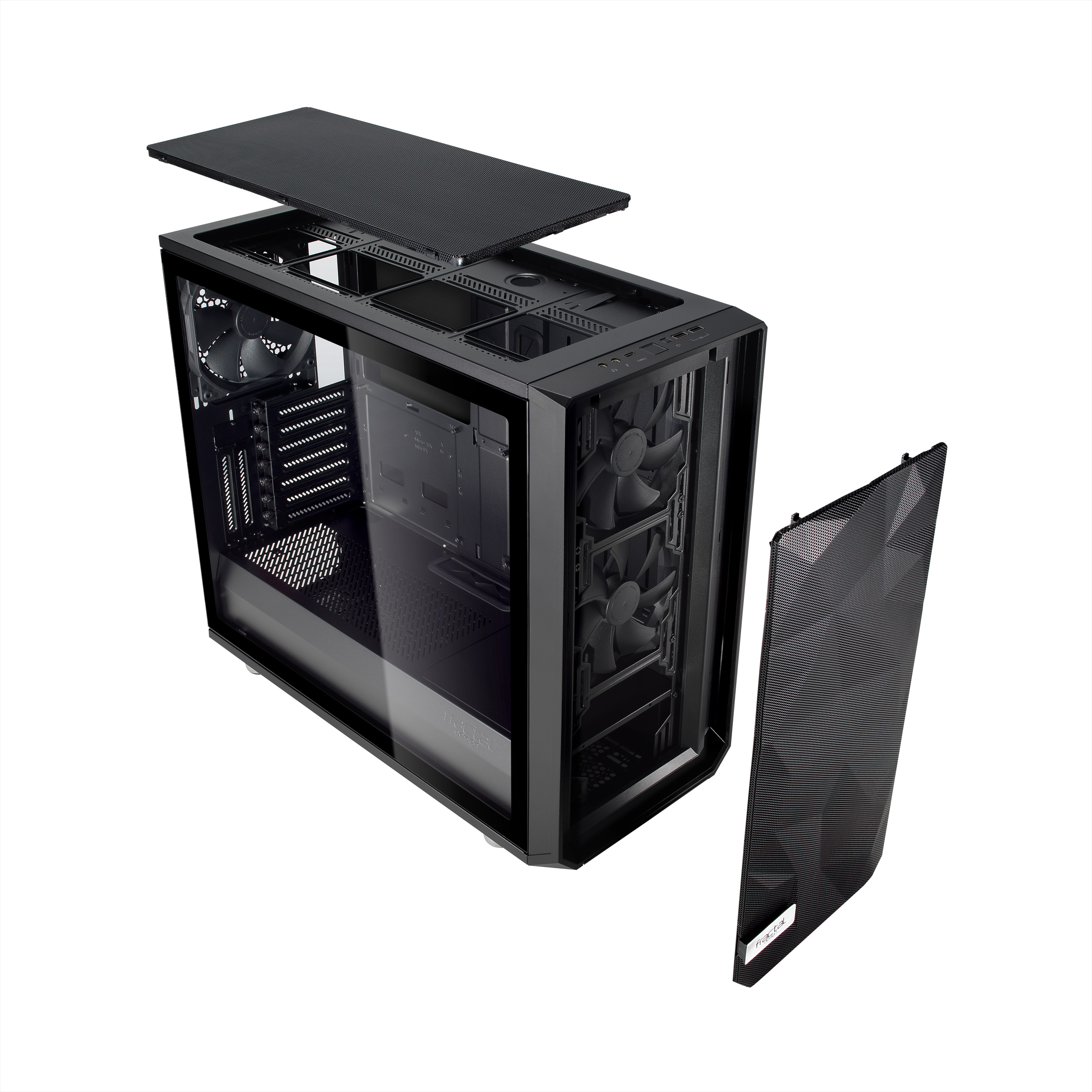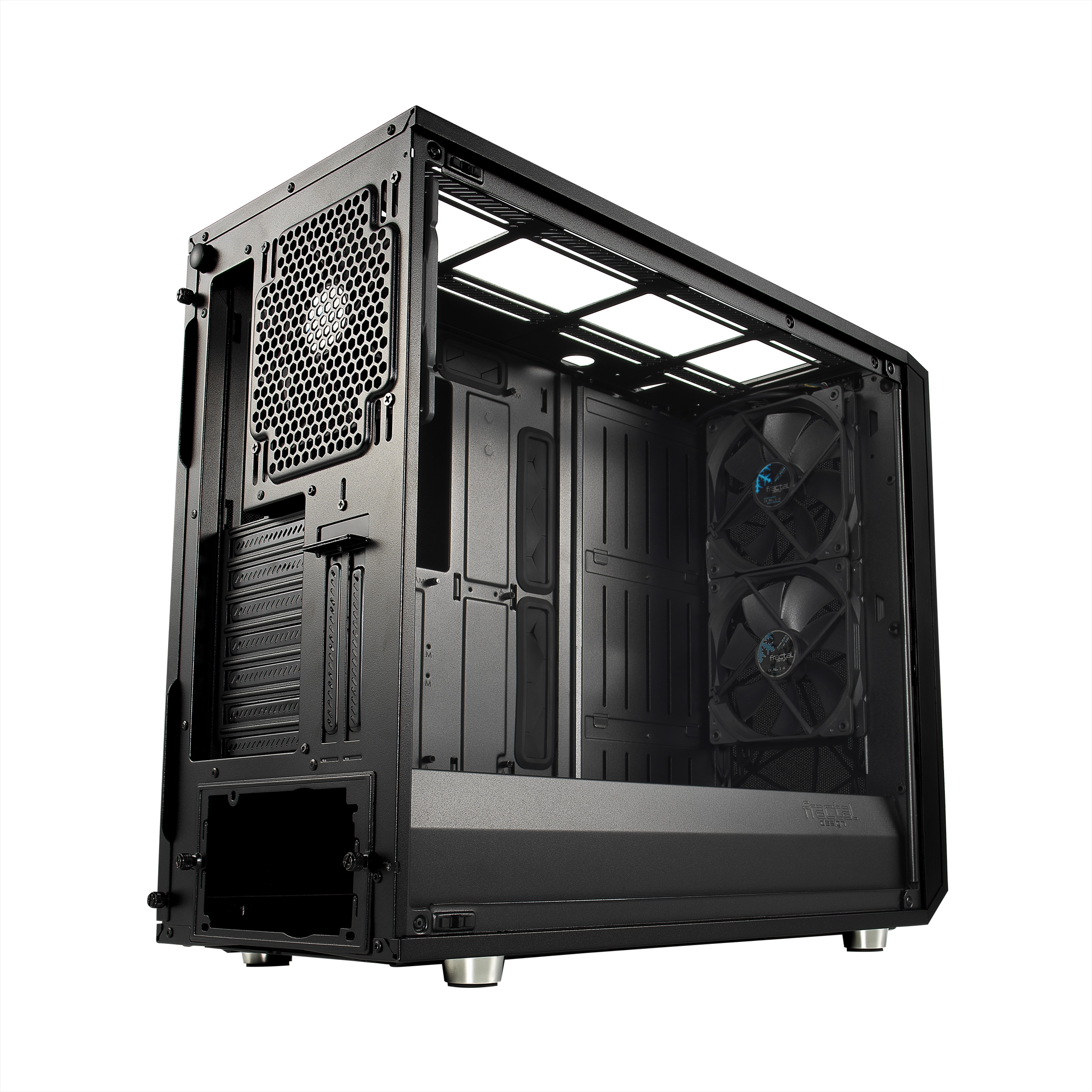 鑽石幾何網孔前面板!這可以說是Fractal Meshify S2的最大特色了,後來也吸引幾家品牌爭相仿效,不過我還是覺得Fractal最有質感,透過不規則幾何圖形上遍佈的金屬網孔來達到散熱,加上最多9顆風扇和最大420mm的水冷排來達到最大化的散熱效果。Meshify S2在機構的設計上也相當優異,幾乎可以稱為是開放式佈局設計….