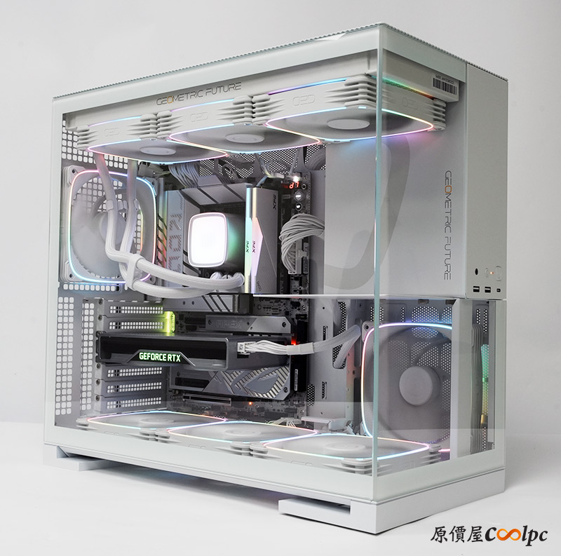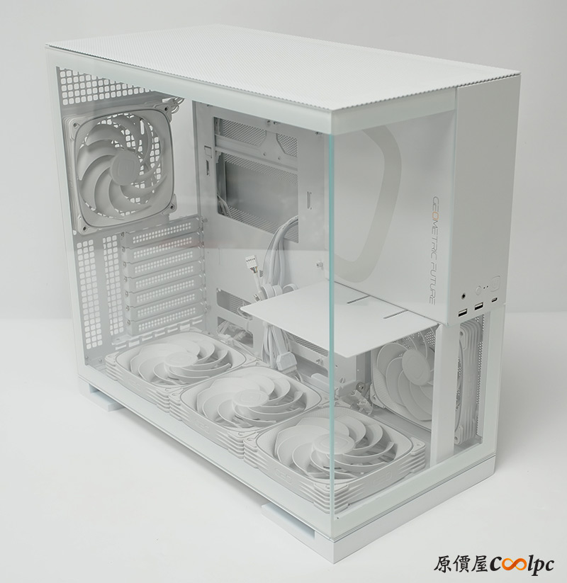 (點小圖放大)接著裝上零件試試,既然頂部有這麼大的空間,當然要弄一組420mm水冷來裝看看,這裡小編就用上幾何未來Eskimo Pro 42水冷散熱器,都是自家出的產品,所以連冷排風扇都和機殼內建的都是同一款,看上去更整齊一致。