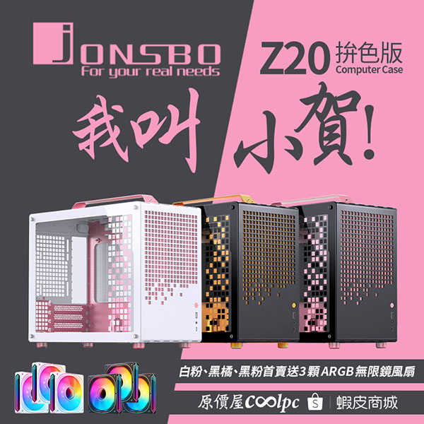 想把家裡那坨笨重的黑炭色 CASE 給扔了!喬思伯 Z20 拼色版機殼,獨具有性能與美的設計感,超棒的 BLACKPINK 偶像配色、橘黑/粉白都好漂亮!面板與側玻璃搭配像素風格,帶來現代科技撞老派點陣式的強烈對比 。可愛的 370 x 186 x 295mm(20L) 小體型中,巧妙安排滿滿的功能性,更保留 DIY 玩家的靈活性!本次首賣重頭戲的贈品 JONSBO FR-505 全幅式無限鏡風扇扇超炫的, PWM 溫控、3 面無限鏡效果搭配 ARGB 燈光,把質感發揮上了極致,支援華碩 AURA SYNC、技嘉 RGB FUSION 2.0、微星 Mystic Light SYNC、華擎 Polychrome RGB 燈光控制,其實算一算喬思伯 Z20 拼色版玻璃透側機殼售價 NT.2690,首波來原價屋加碼送上 3 顆 ARGB 無限鏡風扇(價值NT.897) 真的超划算!至於你說零組件要配甚麼好,可以參考看看>>免萬元的 i9、戰神 i7 和 C/P 值 i5 神 U!