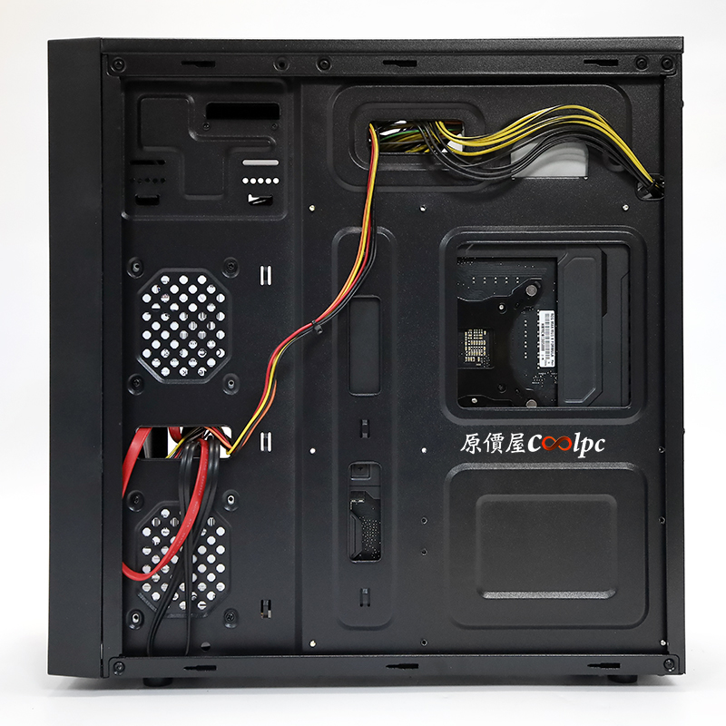背板處的設計可以看到走線孔,基本上裝上ATX 尺寸主機板會擋住兩個走線孔只剩下兩個2.5吋硬碟之間的開孔,所以如果想同時裝兩顆2.5吋硬碟的朋友最好可以搭配半模組或全模組化電源供應器整線會比較方便,或是乾脆整捆束好蓋上側板不管它,反正沒有透側只要不擋到機殼內的風流就行。