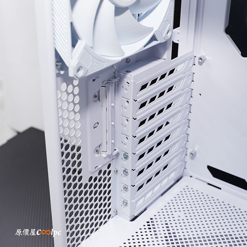 背面內部壓克力遮線蓋和魔鬼氈一樣走一個全白色系,左邊四個 2.5 吋 HDD/SSD 擴充支架,底下則是兩個 3.5 吋 硬碟擴充架。