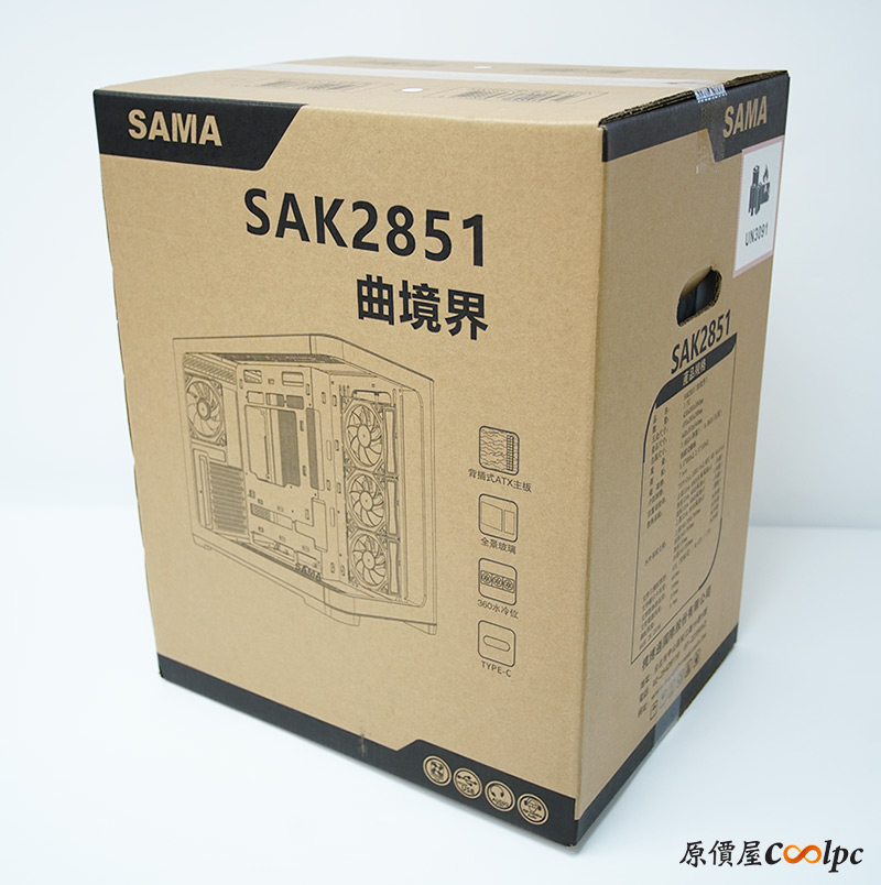 低調的牛皮紙箱,封面有斗大的SAK2851曲境界字樣,下方搭配機殼簡圖,並且簡單列出機殼主要特色,像是支援背插ATX主板,全景玻璃設計,支援雙360mm水冷,提供Type-C連接埠等。