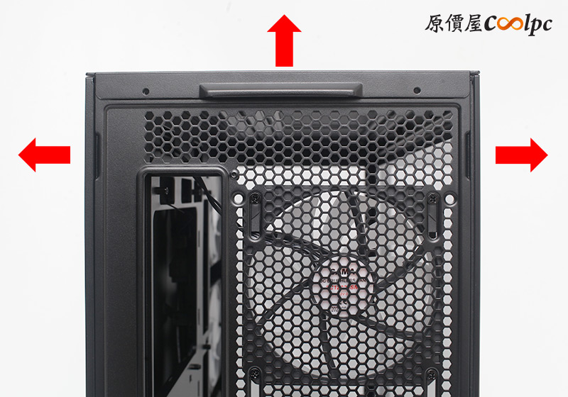 接著拆下左、右、頂部的面板,他們都是透過卡榫固定,按照箭頭的方向往外扳就可以囉!