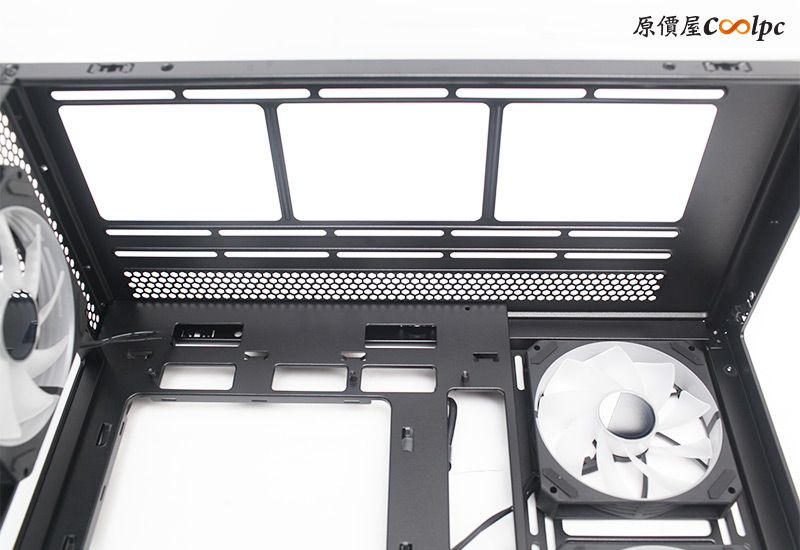 頂部有明顯的挑高設計,方便水冷散熱器安裝,能夠支援360/280/240mm水冷排,個人覺得水冷裝這裡更適合(比起側邊),一方面不會影響顯卡安裝,另方面燈光效果也比較好。想裝風扇則可支援三顆12cm,或者兩顆14cm風扇。