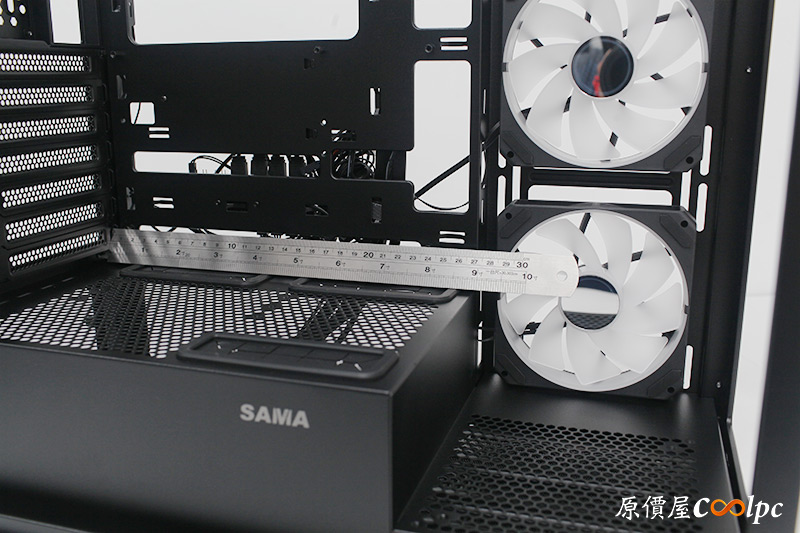 電源長度基本上不受3.5″硬碟影響,支援長度18.6cm電源供應器,實際拿尺量一下,看來裡面保留不少空間可以用來藏線。