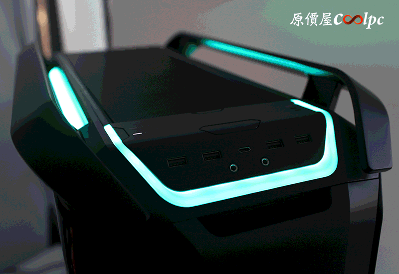 前端I/O及控制鈕,共提供4組USB 3.2 Gen1(Type-A)、1組USB 3.2 Gen2(Type-C)、音源輸入輸出孔、RESET鍵、POWER鍵、風速控制鍵、RGB LED控制鍵,值得一提的是I/O介面為前插式設計,避開大部分的落塵危機,是相當不錯的設計!正前方還有一圈導光條設計,上機後一定魅力四射!