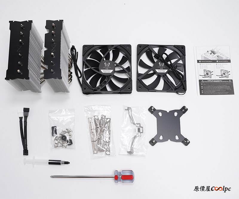 首先介紹無限伍的版本,現在買的版本裡面就已經包含LGA1700腳位專屬配件,不須再額外購買套件!內附散熱膏、螺絲起子、以及兩組風扇扣具,雖然內附一顆風扇,你還是可以自行購買一顆變雙風扇來加強導熱管解熱。