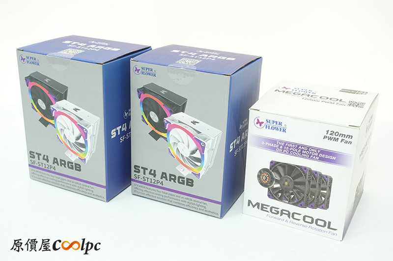 先來張大合照,SUPERFLOWER ST4 ARGB散熱器有黑白兩色,包裝基本上一模一樣,在側邊會有顏色標記,最右邊則是MEGACOOL 120mm PWM風扇三顆包裝。