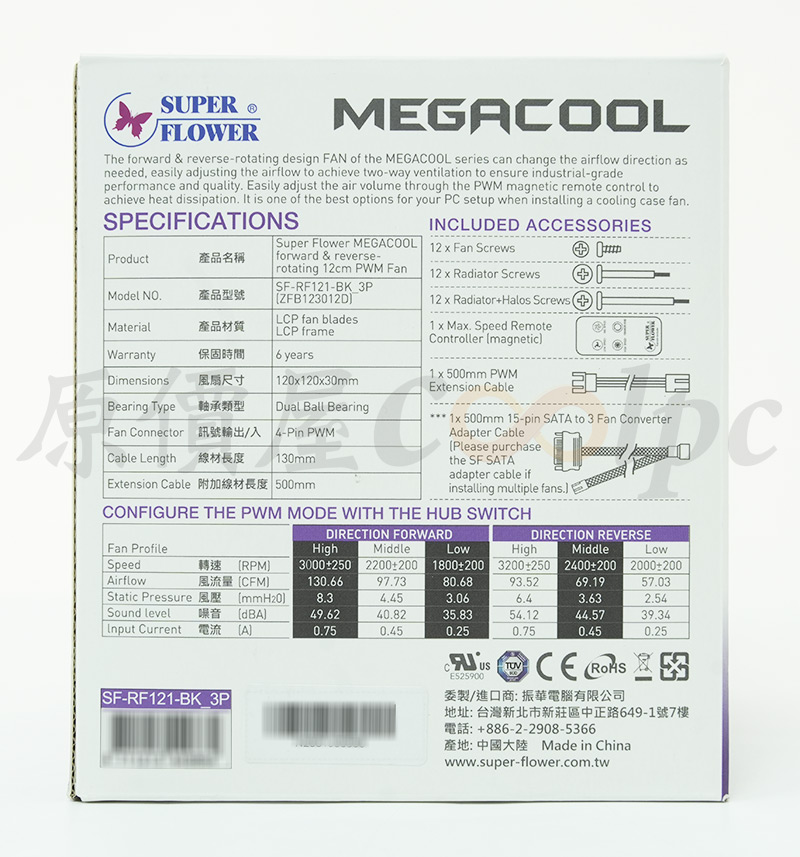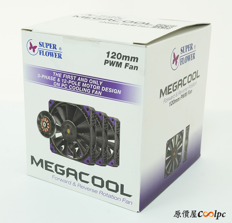 接著是SUPERFLOWER MEGACOOL 120mm PWM風扇,彩盒包裝上有風扇圖照與大大的MEGACOOL字樣,還特別把招牌的三相十二極馬達放大,上方一段文字寫著「第一而且唯一」,肯定是個狠角色。左右兩邊的圖示告訴我們風扇可以變換風向,框架還有加厚強化,背面則有規格表、內容物列表、正反轉性能表可以參考。