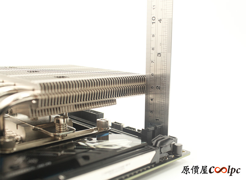 實際組裝就有很多可以變化了,像是改變安裝方向就能產生不同結果,這邊使用ATX尺寸主機板並按照說明書中的方式安裝。可以看出散熱器本體已經在記憶體上空,基本上會蓋過前三個DIMM,最後一個則較不影響,所以這樣安裝在選配零件時得盡量挑較低矮甚至無散熱片的記憶體比較保險。