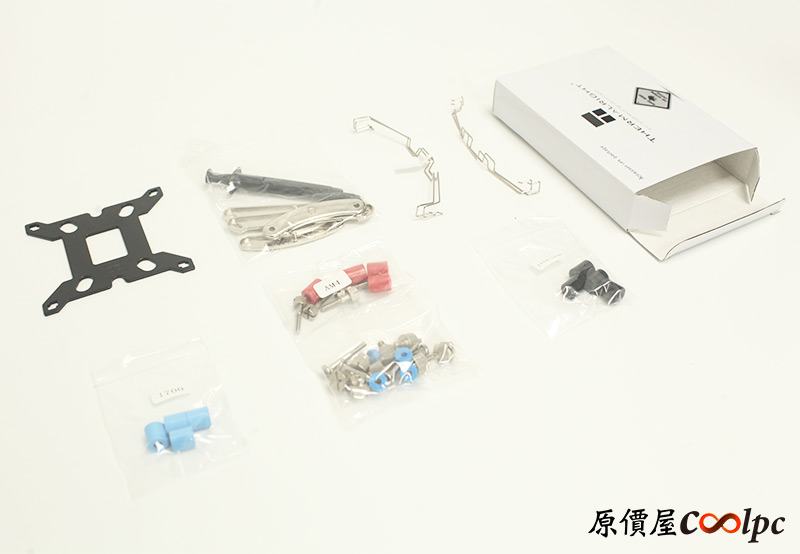 打開包裝會先看到配件包,裡面有各式安裝腳位需要的零件、風扇扣具、intel平台專用強化背板、螺絲、散熱膏等等。