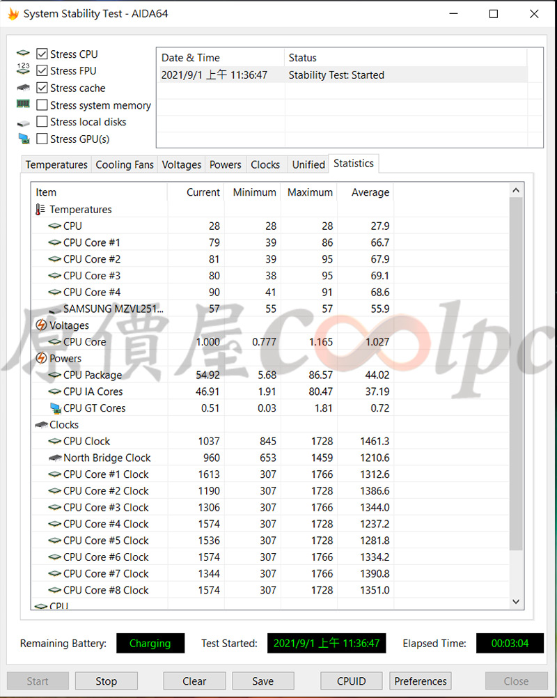 接著將筆電至於CONNECT STAND上,經過約3分鐘滿載測試後CPU與GPU溫度都有小幅度下降,可以看出使用散熱墊對於裝置溫度確實有影響。(點圖片看完整圖)