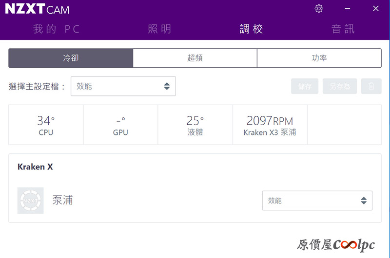 在調教介面能夠控制連接到水冷頭的水泵、風扇,而KRAKEN X63 部分由於風扇是連接到主機板的關係,這邊就沒有出現風扇的控制選項,水泵部分則能夠調整靜音、效能、固定等模式,預設為靜音模式,而下面要進行效能測試的關係Tin 就先將它改為效能模式。