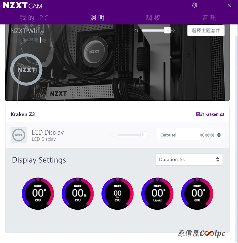 首先看到KRAKEN X63 的燈光控制介面,外環的燈光跟NZXT LOGO 的燈光效果都可以分別控制。