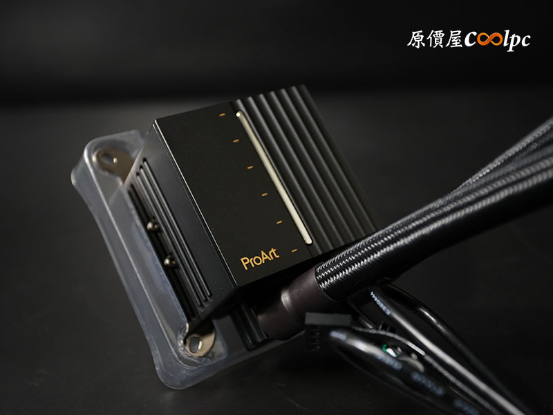 (點小圖放大)雖說是系列中較為簡單低調 ProArt,但冷排上的土豪金色線條及 ProArt 的字樣…很難不被它吸引到,冷排尺寸為 394 x 120 27mm,總共 12 條微水道加速導熱,使用編織網包覆水冷管更耐用,冷管長度 450mm 大幅增加機殼相容性,方正水冷頭上有 LED 發光儀表,可顯示即時系統負載/溫度/風扇轉速,這算是 ProArt 系列產品少見的發光設計!