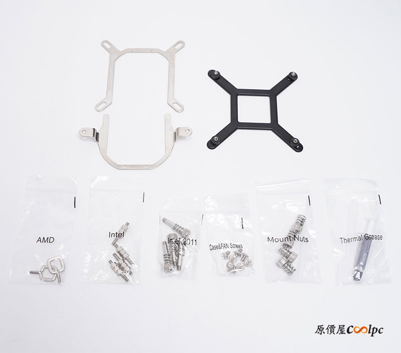 左邊銀色方框和黑色強化底座是INTEL專屬,而U型扣具則是AMD專屬,袋子上也會有寫平台使用的螺絲扣具,可以讓安裝更順手。