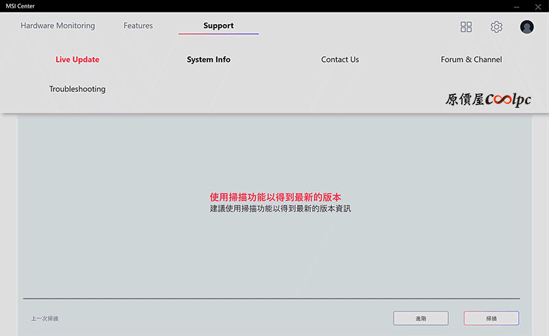 支援服務還有驅動更新、系統資訊、聯絡微星、論壇、售後服務等資訊,還有其他微星軟體可以透過MSI Center來安裝。