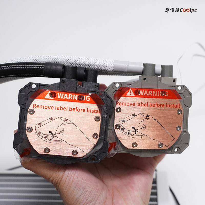240mm 黑/白 ILLUSION兩款型號,裡面除了本體功能和配件相同之外,像是烤漆類型和水管材質都不同!白色漆面為光滑面、黑色則是粗面,水管的部分兩者都是網狀編織,而冷頭採用第三代雙槍式設計,上方銀色酷碼LOGO圓圈還可以轉動,依照安裝方式整到適合的位置!外圍的透明遮罩面積相當廣,過電之後燈光效果肯定非常耀眼!水冷頭供電採用3PIN、ARGB燈光則是客製化接頭,底部散熱接觸面還有一層膠膜!務必在安裝之前一定要將他撕下來唷!不然溫度會很有感XD。