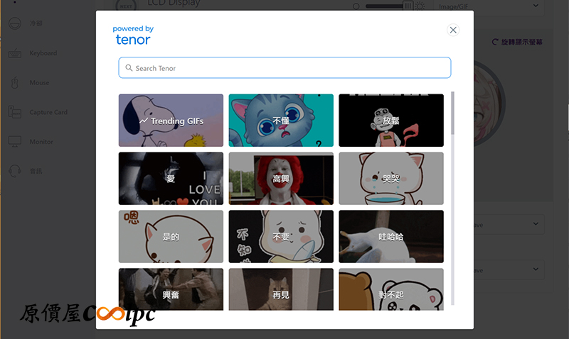 各位若想使用 GIF 當背景,除了自己上傳外,軟體還內建 Tenor GIF 搜尋引擎,這對常用 Discord 的玩家一定不陌生,只要搜尋關鍵字、不限語言,幾乎是可以找到所有的類型 GIF。