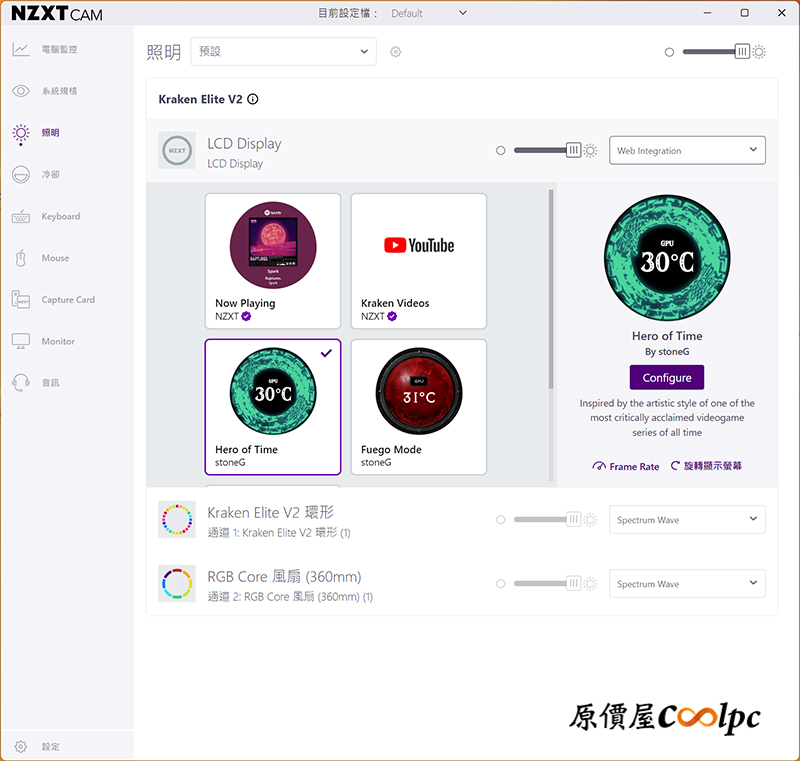 水冷設定主要在”照明”和”冷卻”這兩個分頁,你可以在這裡調整螢幕方向、水冷頭顯示畫面、以及燈光效果。