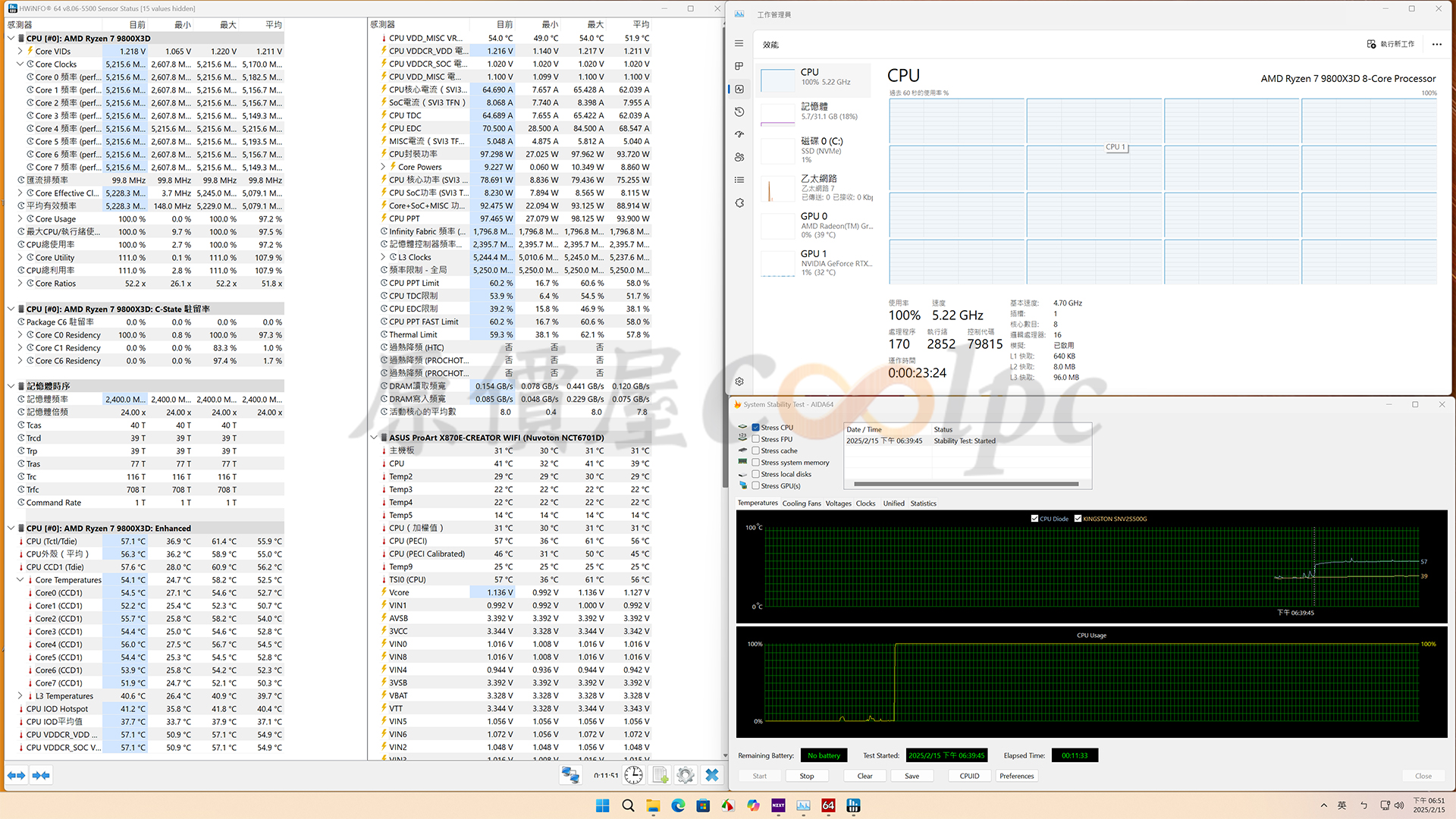 同樣使用 AMD Ryzen 7 9800X3D 處理器進行溫度測試,軟體使用 AIDA64 System Stability 跑 CPU/FPU 燒機,以下為平台測試: