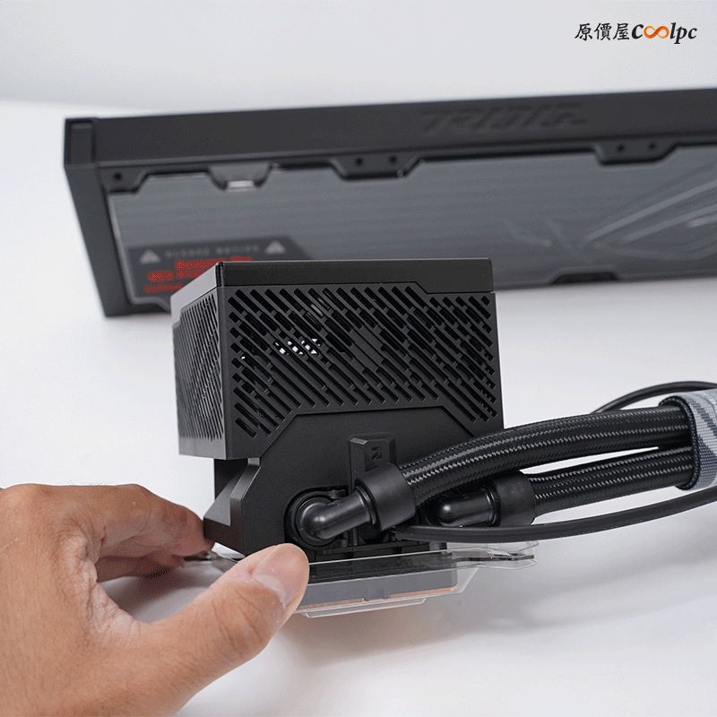 白色外觀的水泵非常好看!外框上的線條和REPUBLIC OF GAMERS LOGO比較明顯。