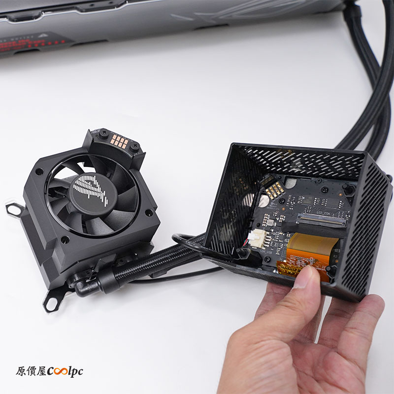 冷泵外觀為大面積方形設計,外框還有線條和REPUBLIC OF GAMERS LOGO組成,上方3.5吋全彩LCD還有一層膜保護謢,它的解析度為320×340@60Hz、24 bit 色彩位元深度,顯示器的記憶體容量從16MB 增加至 32MB﹐可播放影像畫格由 500張提升至 2000 張,並支援 60FPS 動畫播放,帶來真實色彩及流暢的畫面顯示。水泵馬達轉速為 800~3600 +/- 10%RPM,更進一步提升水流速和減低水流阻力,並帶來更寧靜的工作運轉。