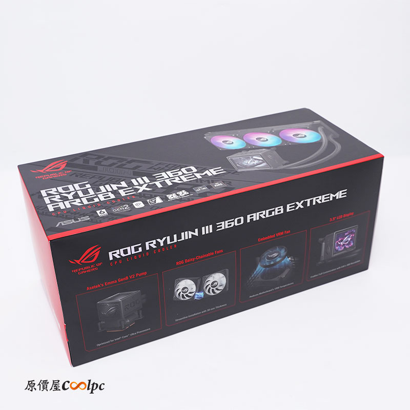 @2024/12/03 ,11:50華碩 ROG RYUJIN III 360 ARGB EXTREME 這可是專為 Intel Core Ultra 200S 處理器而生的一體式水冷系統,可調偏移支架讓冷頭接觸面積更接近發熱點,可以更快速幫助處理器解熱,全新的 Asetek Emma Gen8 V2 幫浦方案,配上加厚三公分的 12 公分 ARGB 磁吸式風扇,壓制能力會比標準版的ROG Ryujin III 360 ARGB 水冷系統更好!水冷頭內部也有嵌入式風扇,可以幫忙主機板 VRM 降溫,螢幕一樣是 3.5 吋 IPS LCD,解析度也提升到 640 x 480 (原本 320×340),一樣可以顯示自訂 GIF 動畫或即時監控時脈頻率、電壓、溫度、風扇轉速或冷卻液流量等資訊,還能使用 Giphy (預計2025/01月上線) 網站圖庫,挑自己喜歡的梗圖放上去,讓你不用找半天超讚的啦!保固一樣是六年,保固內含非人損漏液損害賠償和非人損換新服務,品質有保障!現在讓我們一起來看看它的開箱吧!