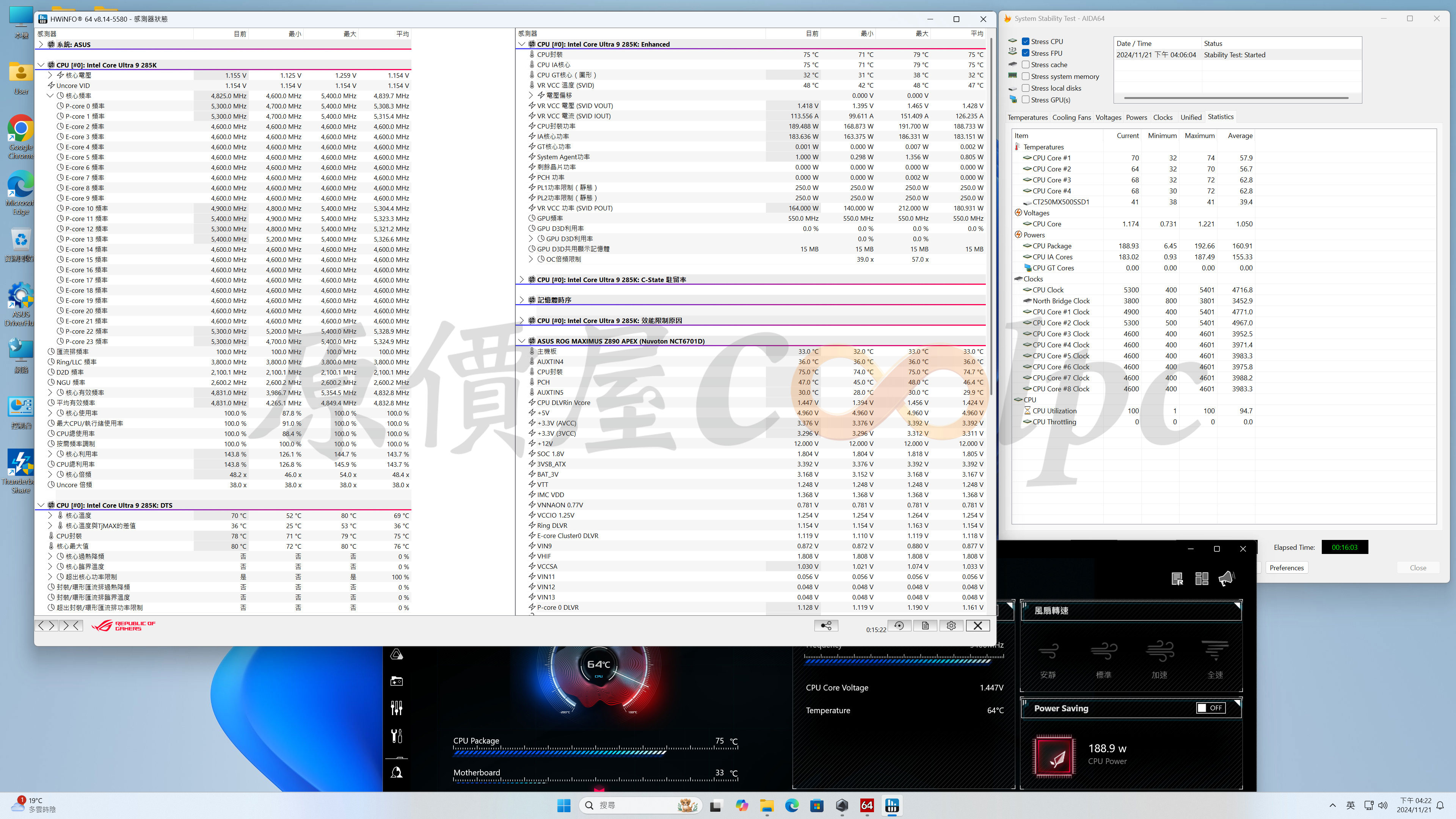 (點圖放大)接著就是溫度測試!小編使用 Intel Core Ultra 9 285K 處理器,BIOS 為 Intel 模式,透過 AIDA64 燒機軟體 CPU + FPU 一起,P 核心約 5.4/5.3 GHz、E 核心則是 4.6 GHz,滿載功耗約 189 W,相較 12/13/14代處理器功耗確實有大幅下降,CPU 封裝溫度最高 79 度,平均約 75 度。