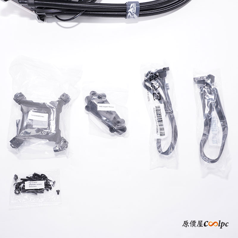 配件包的部分有 Intel、AMD 專用套件和兩條磁吸式傳輸線以及固定風扇和固定冷排螺絲。