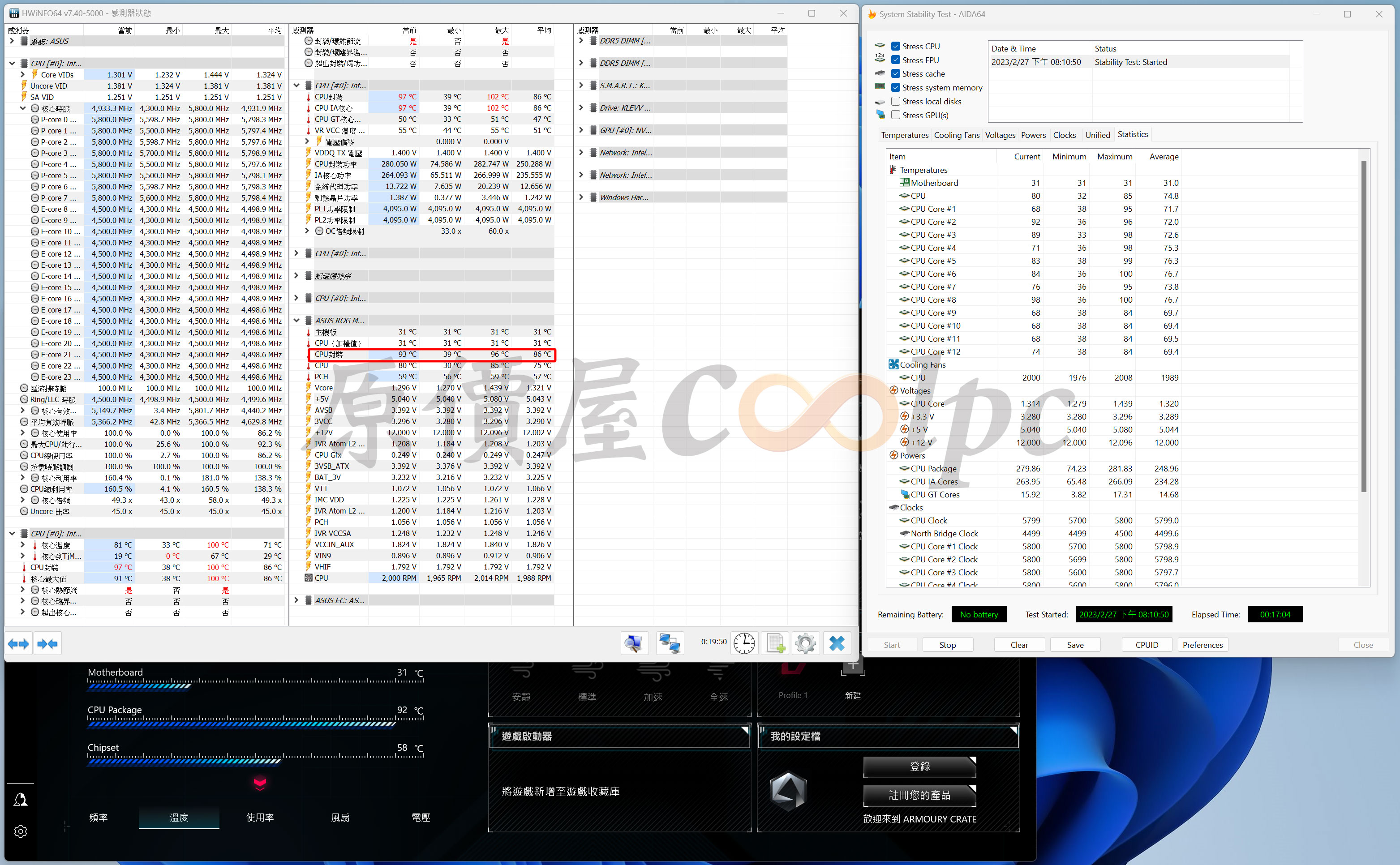 緊接著就是實際測試溫度表現了!小編使用的處理器為Intel 13代i9-13900KS處理器,全預設下透過AIDA64滿載測試15分鐘,可以看到瓦數最高294W,時脈P核心分別5.5GHz、5.4GHz、5.3GHz,E核心則是4.3GHz、4.2GHz,平均86度,最高97度,表現相當不錯。