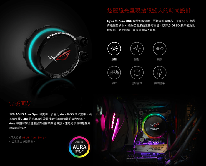 雷神THOR終於落入凡間,帶來10年保的ROG THOR 850W/1200W白金電源,具備OLED面板技術可及時顯示耗瓦數,且支援ASUS AURA SYNC燈光同步,13.5cm防塵翼型葉片風扇搭配ROG散熱片達到完美散熱,日系電容、全模組設計、單路+12V輸出、提供OPP/OVP/SCP/OCP/OTP五項電源保護,種種扎實的設計及保固都讓人放心,模組的設計在整線美觀上能有更好的發揮空間,而大瓦數的設計早已為高階主機平台及SLI配置做好準備!還是得注意ROG THOR 1200W長度達19cm(19x15x8.6CM),機殼得注意PSU長度,以免裝不上去,搞定了顯示卡後接著是CPU,都用上ROG THOR等級的電源了,當然得搭一套ROG RYUO 240龍王一體式水冷啦!支援ASUS AURA SYNC燈光同步,具備1.77吋全彩OLED面板設計,除了可顯示硬體溫度資訊,更能自訂LOGO,以水冷來說這完全是神一般的操作,且支援Intel 115X/2011-3/2066、AMD AM4、TR4(需扣具)等相當廣泛的平台!