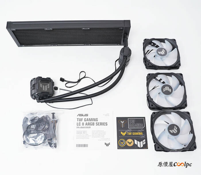 所有的配件有水冷本體、三顆ARGB風扇、扣具包、使用說明書、TUF GAMING 貼紙。