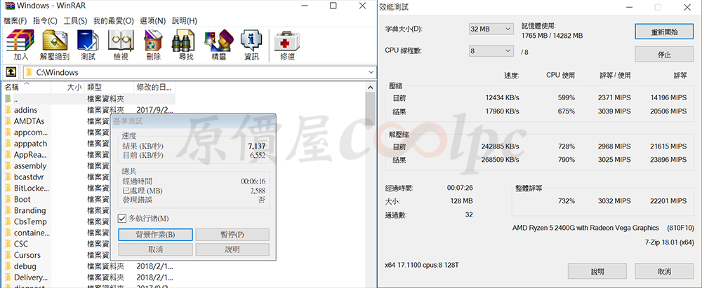 WinRAR基準測試以及7-Zip性能測試部分。