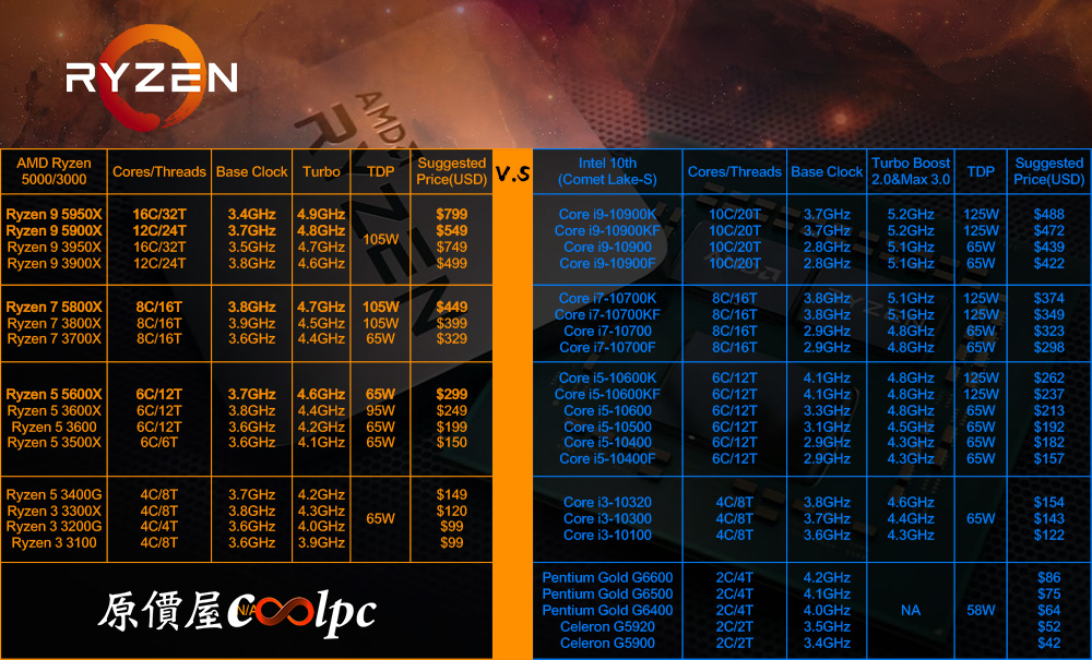 (點圖放大)AMD Zen 3(Ryzen 5000)目前共有R5 5600X/R7 5800X/R9 5900X/5950X,分別是6C12T/8C16T/12C24T/16C32T,以家用主流市場來說,5950X毫無懸念又以多核優勢直接輾壓,核心效能為3.4~4.9GHz、L2+L3共72MB快取並維持TDP 105W,且提供PCIe 4.0資源,從列表來看,AMD產品線從入門就是4C8T起跳,且全系列不鎖頻,愛怎麼超皆無限制,甚至有Precision Boost 2,Precision Boost Overdrive 3加持,各方面來看都比i家優秀不少,定價稍微貴一點點也合理!
