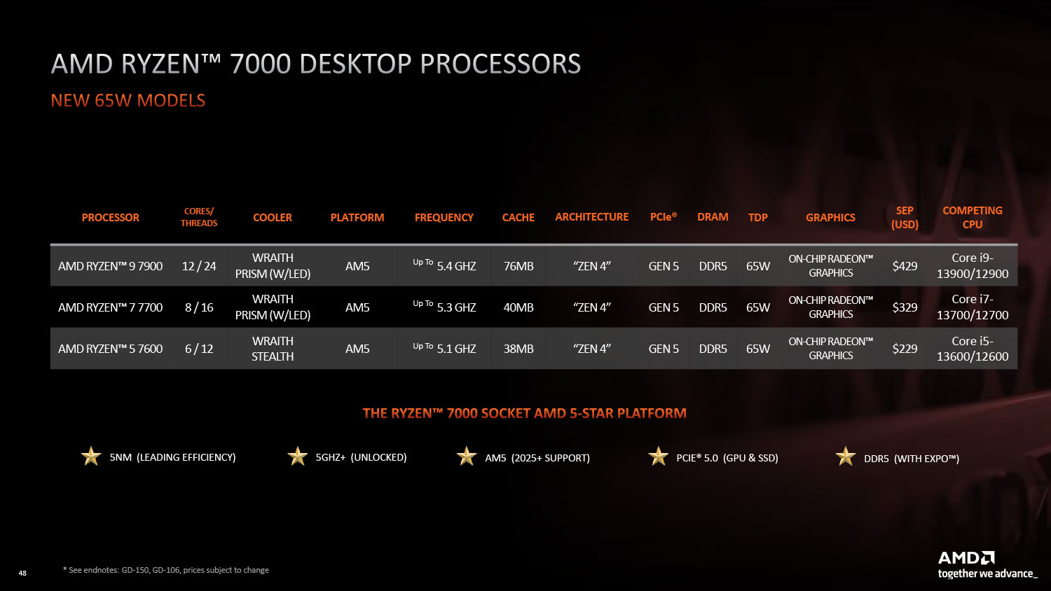 主流款性能任你超,這才是王道!上市前就有發現媒體時不時走漏一點點資訊出來,在 i 皇 13 代 Non-K 推出後馬上端出來,原來引而不發就在等這一刻…AMD Ryzen 7900(12C/24T)、7700(8C/16T)、7600(6C/12T) 處理器保有全系列不鎖頻的優良傳統!除了 TDP 65W 節能特色 & 內附散熱器外,還有五大重點:台積電 TSMC 5nm 先進製程、5GHz+ 超頻時脈、AM5 最新架構、PCIe 5.0 & DDR5