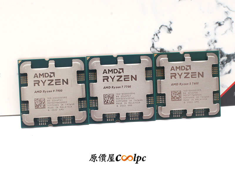 Ryzen 7000 系列鐵蓋上開了 8 個口,視覺上滿衝擊的,就是切記導熱膏適量就好,塗太多不只對導熱沒幫助,反而造成下次清理的時候不方便!將 AMD Ryzen 7600/7700/7900 處理器擺一塊,正面資訊可得知是由台灣代工,最後在馬來西亞組裝!AM5 為 LGA1718 設計,將針腳移到主機板上,老玩家可能會有種拿到 Intel CPU 的錯覺…。