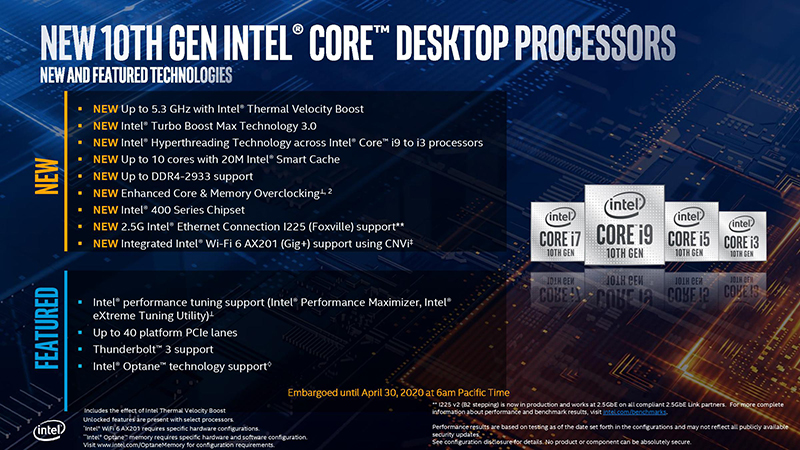 10th+Z490平台不僅包含Intel Extreme Tuning Utility超頻軟體、40條PCIe Lanes、Thunderbolt3支援、Intel Optane Memory等經典特色,也優化了核心及記憶體超頻性能、網路I/O提升2.5GbE有線網路及Wi-Fi 6 AX201無線網路技術,Core i7以上系列具備Intel Turbo Boost Max Technology 3.0,10核心的Core i9系列升級20M Cache,再加入Intel Thermal Velocity Boost,讓全核心時脈能有更進一步的提升!i9-10990K單核最高5.3GHz,全核最高4.9GHz,論核心效能,Intel還是穩的一把!