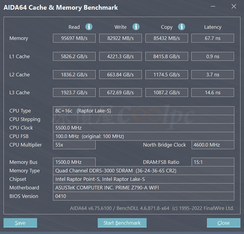(Gear 2 Mode)最後手動調整到 6000MT/s(CL36-36-36-76),其實小編是用最傻瓜的調整方式,開了XMP 後直接調 6000MT/s 能過則過!透過 AIDA64 記憶體測試效能結果:Read 95697MB/s,Write 82922MB/s,Copy 85432MB/s,延遲 67.7ns,從 4800-6000MT/s,從結果來看…不論讀取、寫入、拷貝表現都有大幅提升!