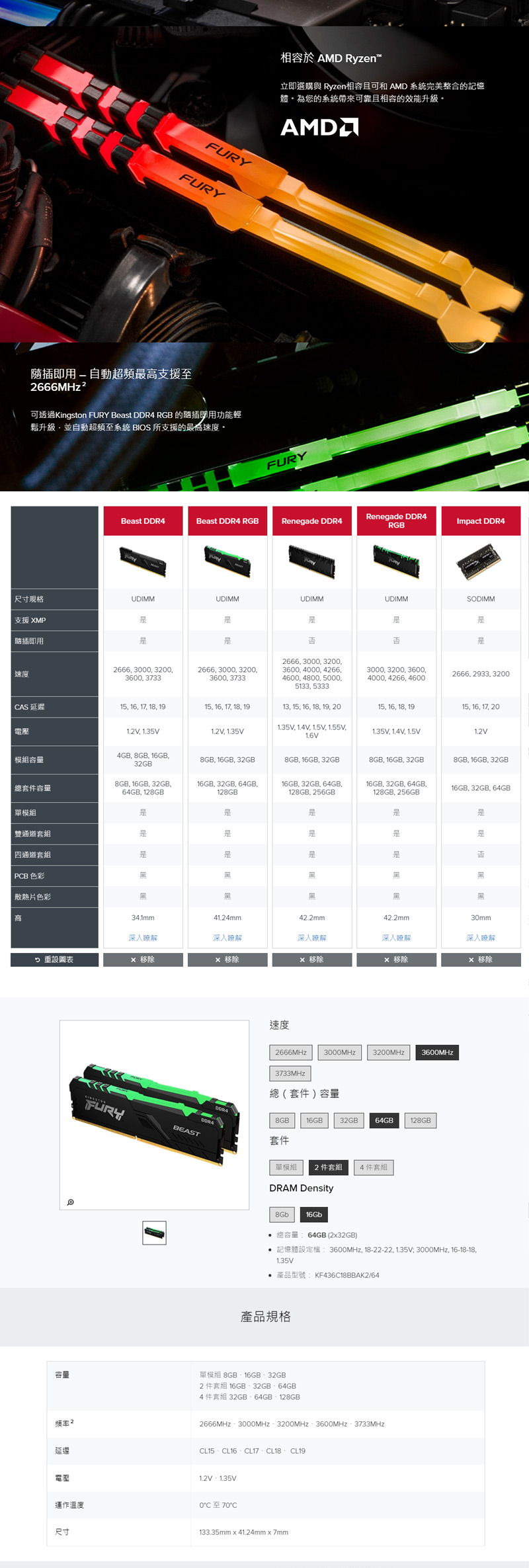 金士頓 64GB(32G*2) DDR4-3600 FURY Beast 獸獵者 RGB (KF436C18BBAK2/64) 官網
