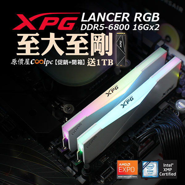 老實說現在 Win11 遊戲機至少要 32G RAM 比較妥當,不然開個瀏覽器開個 3A 遊戲大作就很吃緊了,搭配這檔活動威剛 XPG LANCER RGB DDR5 6800 16Gx2 送 1TB SSD 確實划算!D5-6800 CL34 體現時脈高、延遲低的優勢,在遊戲或工作領域能有明顯的效率提升,支援 AMD EXPO & Intel XMP 雙參數讓兩大龍頭用戶都吃香!論質感嗎?雙面金屬散熱片 + 髮絲紋、斜切紋處理,就算不發光也很吸引人,再者它的 RGB 導光設計可支援 ASUS AURA SYNC、MSI Mystic Light SYNC、GIGABYTE RGB Fusion、ASRock Polychrome RGB 各大廠燈光同步軟體,讓你的 PC DIY 裡裡外外一同為你喝彩!
