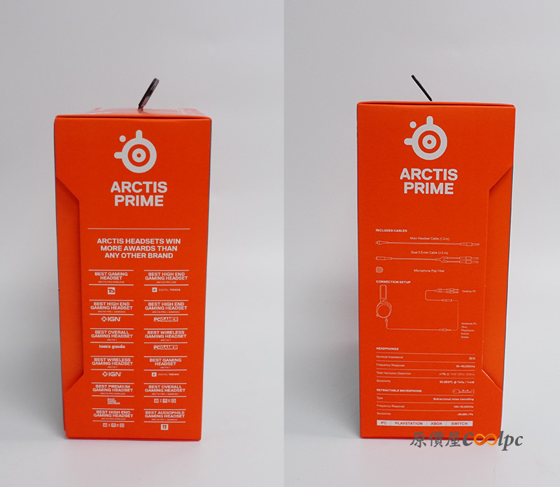 內容包含ARCTIS PRIME耳麥,可拆卸4 極 3.5 mm主要線材、雙孔 3.5 公釐延伸纜線、麥克風防風罩。