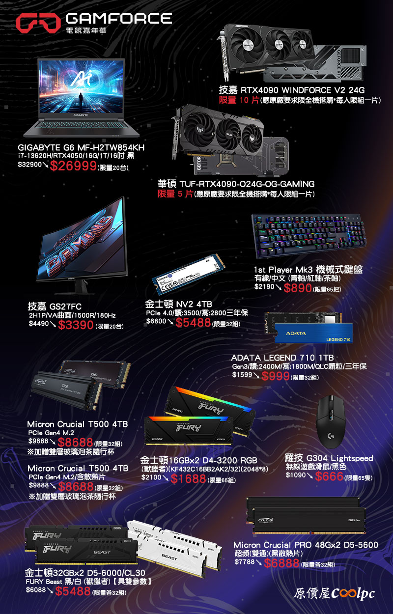 就算經過不知道在排甚麼…也是先排再說啦!2024 GAMFORCE 電競嘉年華堪稱遊戲玩家們的年貨大街!且是你今年最後能組到 Ryzen 7 9800X3D 處理器和 RTX4090 顯示卡的機會了!原廠釋出搶破頭的華碩/技嘉 RTX4090 顯示卡,應原廠要求,顯示卡限全機搭購!還有…直接下殺近六千元的技嘉 G6 MF-H2TW854KH 電競筆電,規格是 i7+RTX4050 且是 16 吋 16:10 大螢幕,不過先說限量 20 台先搶先贏!再來還有 27 吋電競螢幕、千元有找的 1st Player Mk3 RGB 機械式鍵盤、NT.666 帶走羅技 G304 Lightspeed 無線遊戲滑鼠、超滿足且快速的 4TB/1TB M.2 PCIe SSD、DDR5 32GBx2/48GBx2、DDR4 16GBx2 超頻記憶體,當然…活動檔期不是只有當日的排隊商品,還有小主機、螢幕、顯示卡、SSD外接盒、機殼、電源、水冷散熱器、耳機、鍵盤、滑鼠、NAS、隨身碟、網通…更多活動促銷已經幫各位整理好懶人包啦!>>【2024 GAMFORCE 電競嘉年華活動串】