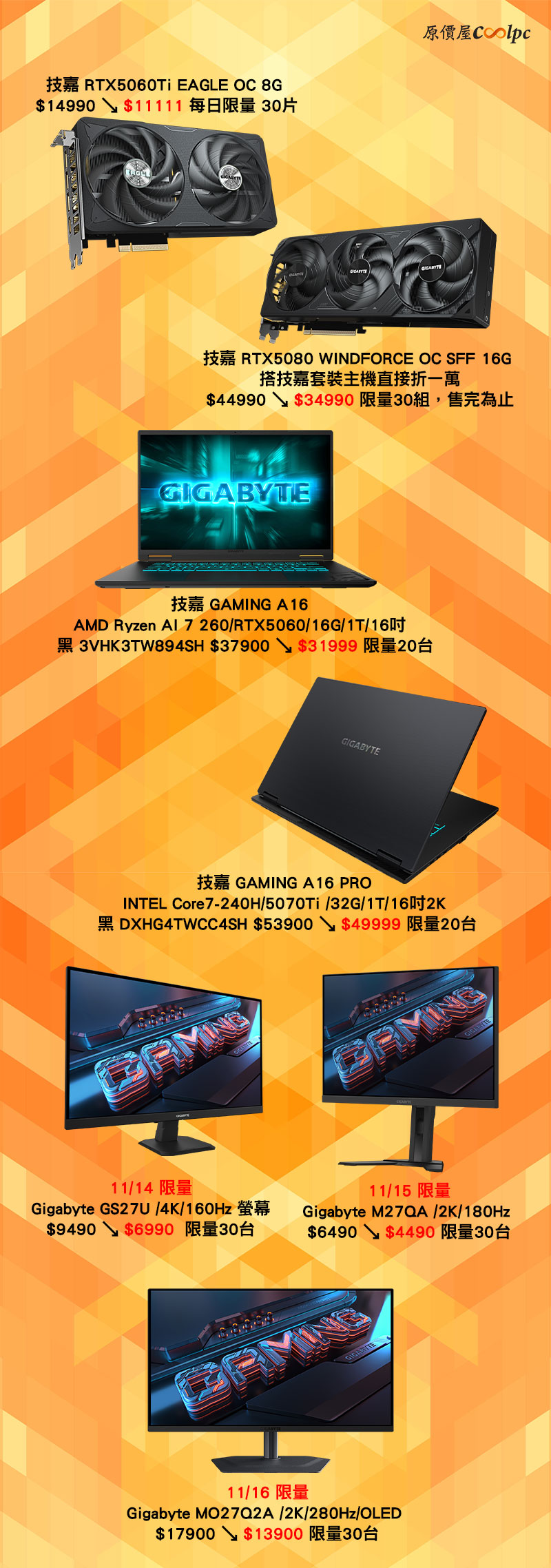 只有四天限量售完為止!這個周末不知道去哪,就來士林圓山 WirForce 逛逛吧!11/13~11/16 免費入場參觀,現場我們也準備了許多超殺每日限量商品,像是技嘉 RTX5060Ti EAGLE OC 8G 顯卡,展場四天每日限量 30片 只要 $11111 (原價$14990),技嘉 RTX5080 WINDFORCE OC SFF 1…