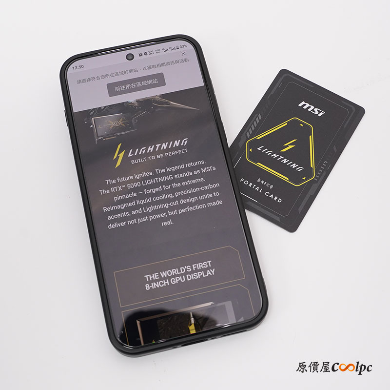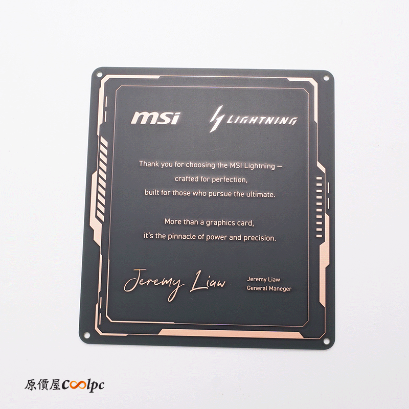 MSI RTX 5090 LIGHTNING Z 浮誇登場!完整 8 吋 顯示卡有貼戰鬥機的膠膜,安裝就定位後就可以把它撕下。