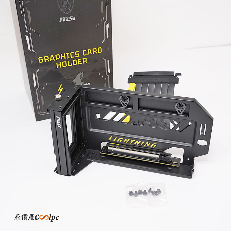 配件盒的部分相當豐富!有 BIOS switch Tool Key Chain 鑰匙圈、兩個 LIGHTNING 磁鐵、NFC CARD(官網介紹連結)、PCB 板感謝卡、迷你 LIGHTNINIG 顯卡磁鐵、USB-C To USB-A、簡易顯卡支撐架、三條 V-Check 線材(測量 GPU 電壓)、16-pin 一對四轉接線材,和一組專屬 LIGHTNING 顯卡垂直支撐架(含 PCIe 延長線)。
