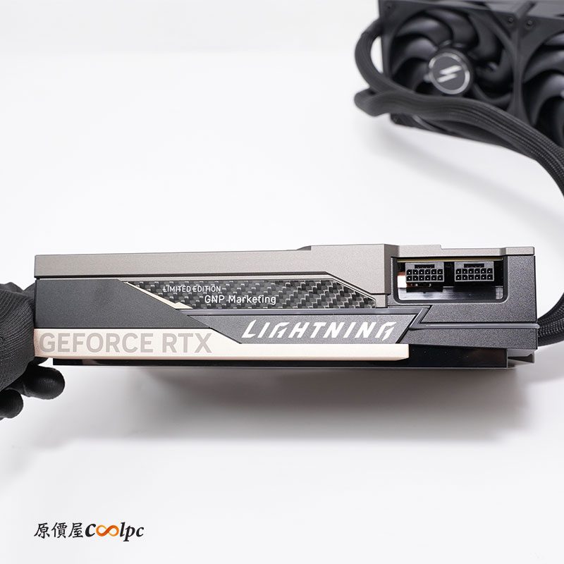 側面可以看到 GEFORCE RTX 香檳金屬邊框,和 LIGHTNING Z 字形柔光條,通電過後會有燈效;中間碳纖維的部分,因為小編拿的是行銷開箱品,所以沒有限量號碼,實際販售會有限量 xxxx/1300 獨立編號,保證獨一無二。供電採用雙 16 Pin 12V-2×6 介面,電源供應器官網建議 1500W+等級。