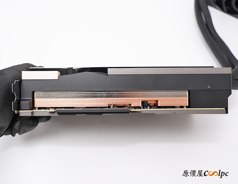 顯卡底部可以看到超大面積銅製冷板,完整覆蓋 GPU、 VRAM、MOSFET 模組,透過水冷幫浦快速將熱源帶到散熱鰭片上,溫度與效能隨時保持最佳狀態。