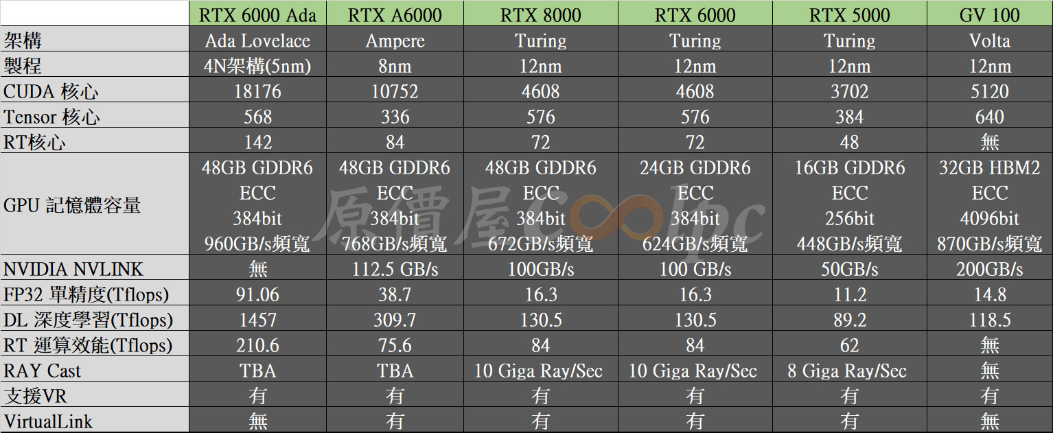 整理出歷屆以來的繪圖卡規格,從圖表可以看到NVIDIA RTX 6000 Ada Generation 採用台積電4N製程,和Gefoce RTX 4090一樣是AD102晶片,提供18176個CUDA核心數量(非滿血版)、568個第四代Tensor和142個第三代RT核心,相較上一代Ampre製程的RTX A6000 繪圖卡王,光是FP32單精度、深度學習、運算效能都有高出兩倍以上,效能絕對是有感提升啦!記憶體的部分為GDDR6 384bit 960GB/s頻寬 48GB記憶體,並支援ECC除錯錯誤修正碼,確保資料精確度和穩定性,供電接口也改用最新16pin(12+4) 12VHPWR插槽,繪圖卡的功耗為300瓦,還有三組第五代解碼引擎、三組第八代編碼引擎(+AV1 編解碼),為影像創作者帶來更快速的編輯效率。